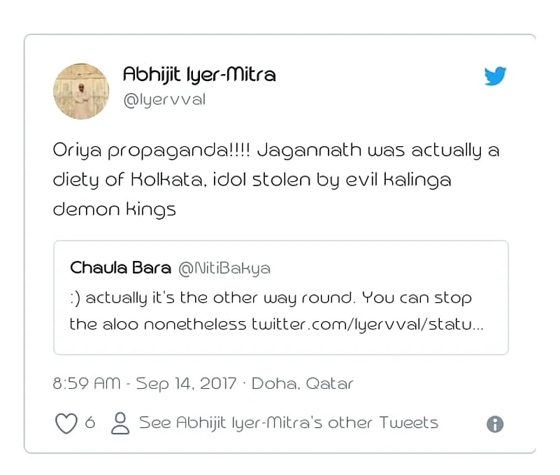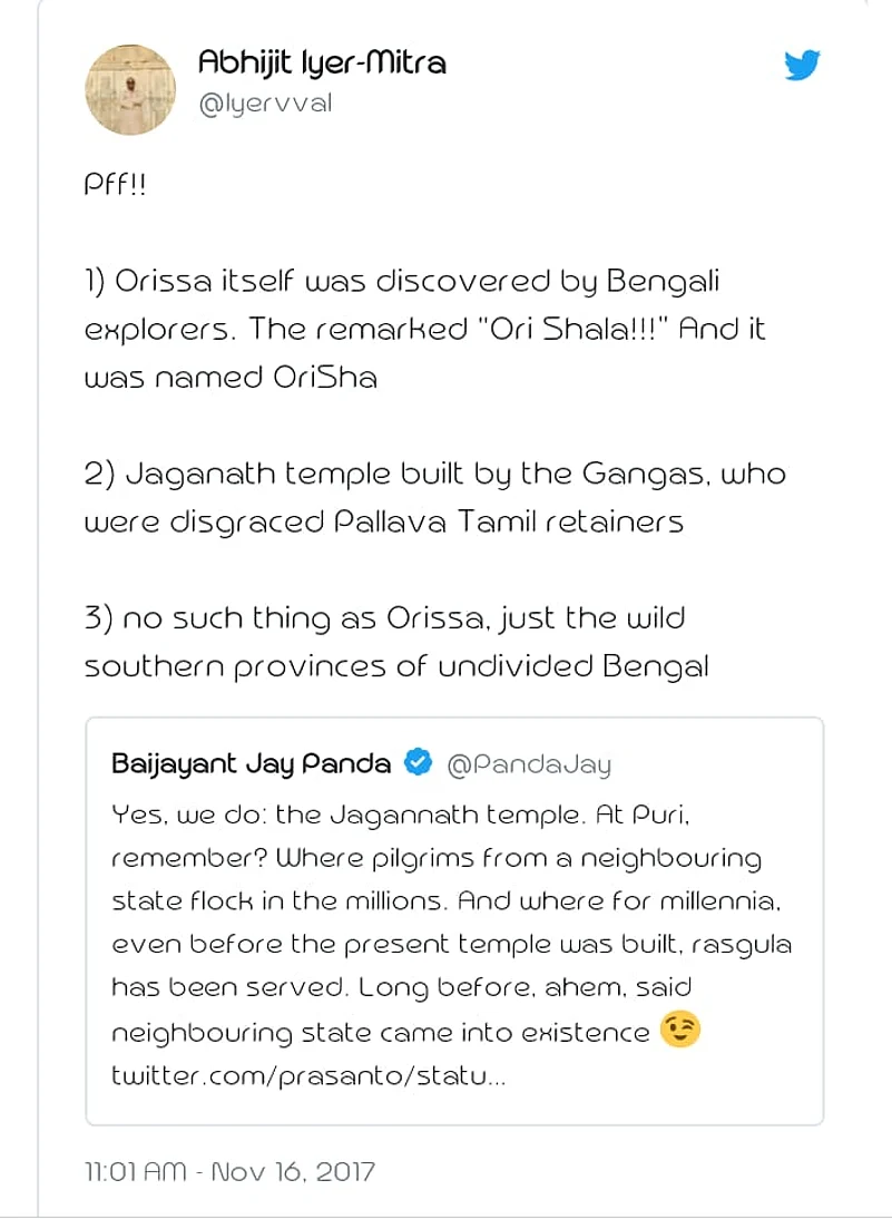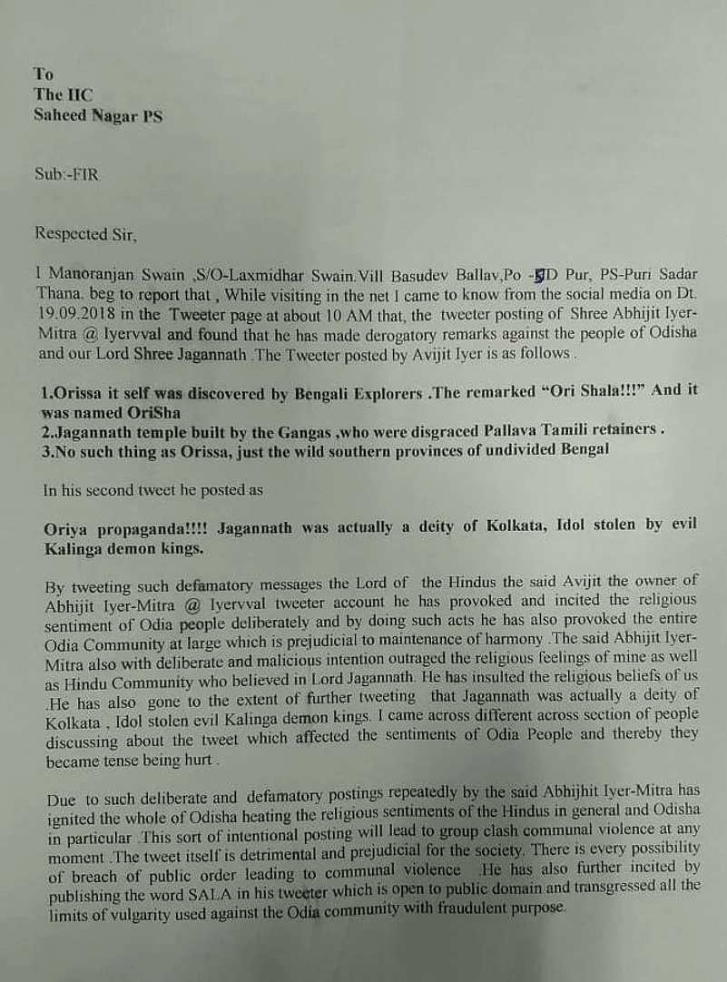 Curiously, the FIR lodged in Sahid Nagar police station, on the basis of which Iyer-Mitra was arrested on Tuesday, made no mention of the video on the Sun Temple in Konark he posted in social media during his visit to the state in September. It cited some one-year-old tweets in which Iyer Mitra allegedly made derogatory remarks about the origins of Odisha, its stand on ‘rasagola’, Lord Jagannath and Odia culture.