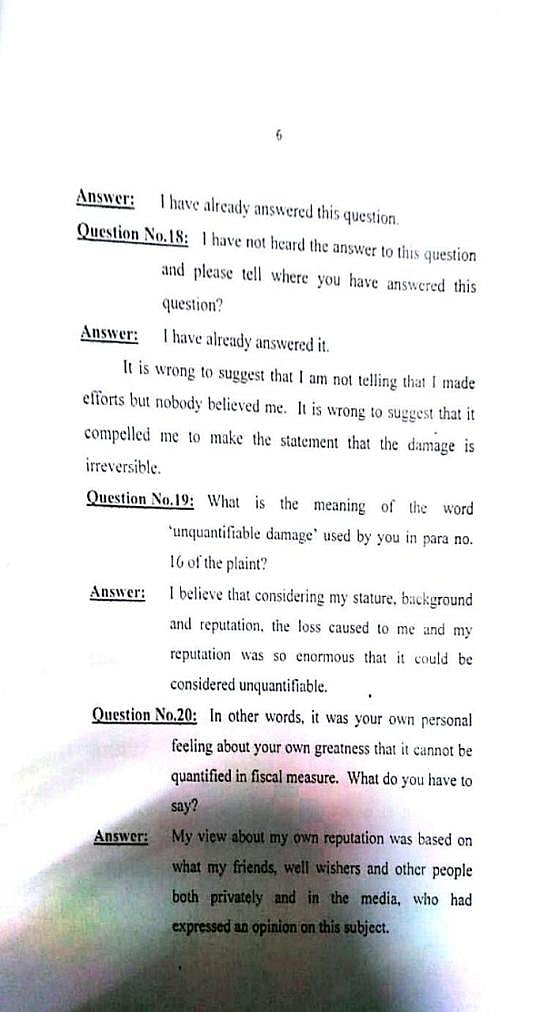 During the cross-examination, Jethmalani asked Jaitley why he had said that the real damages for the defamation had been "unquantifiable" and if it was because no real damage had been done.