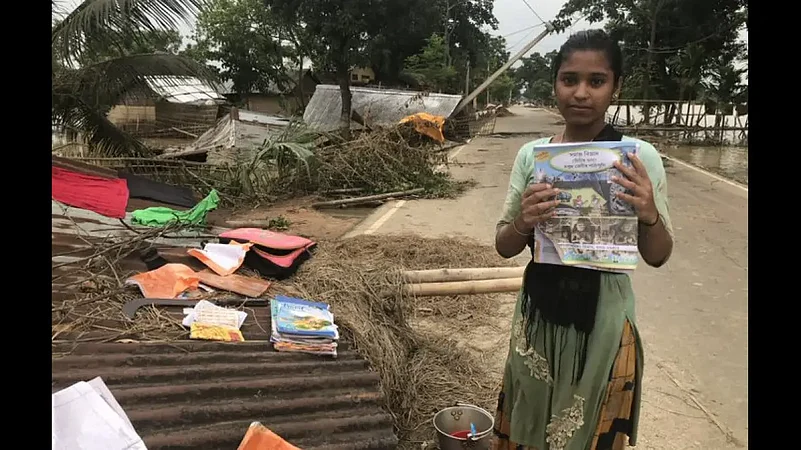 On a gloomy Monday morning, 14-year-old Nazima Khatun was seen drying up her textbook upon a tin alongside the road in No. 1 Fakuli village in Kampur revenue circle of Nagaon district. The sun was hiding behind the clouds, and the rain had stopped for a while. The Class 7 student of Kameswar Borthakur MV school in Kampur, had arranged the books in a line. The cover of most of them had washed away. She carefully examined the glue that held the pages together, trying to salvage whatever was left of the books.