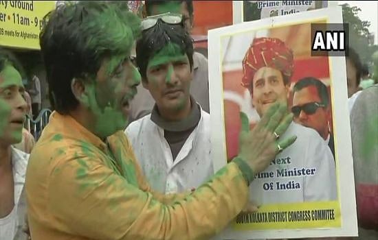 1:20 pm: Meanwhile in Kolkata, Congress workers celebrate on streets with posters of party president Rahul Gandhi.