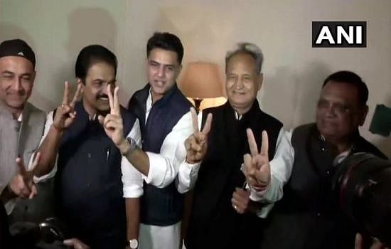6:05 pm: Visuals of Ashok Gehlot, Sachin Pilot and other Congress leaders in Jaipur. Congress party has won 46 seats in Rajasthan and is leading on 51 seats, all set to come back in the state.