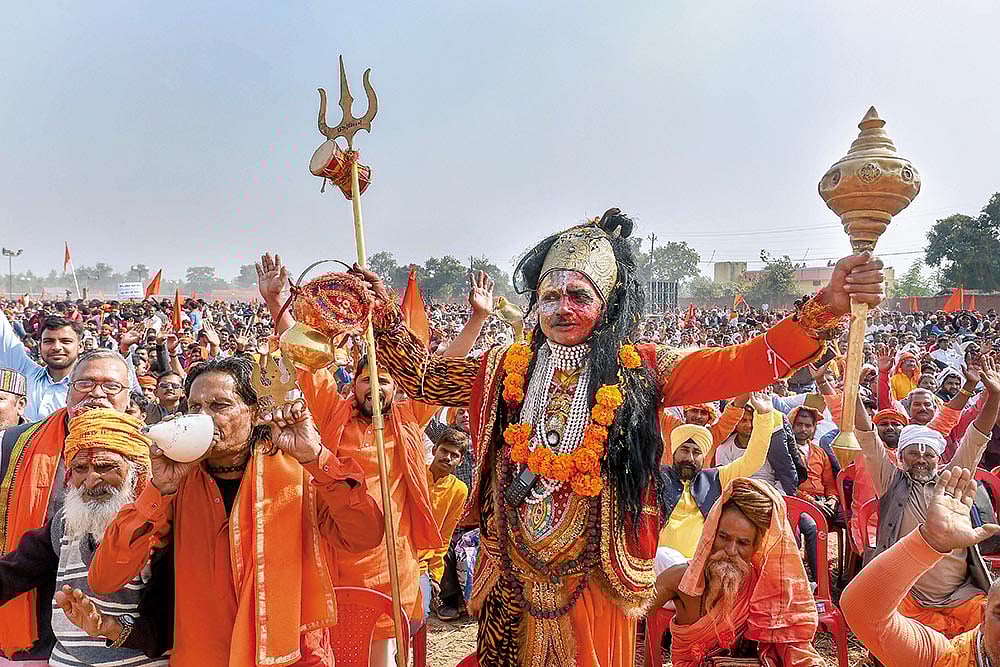 It was a VHP dharam sabha that, in early 2013, made the first formal demand that Narendra Modi be made the PM candidate—so the words spoken there are no fringe theatre. Now, a new demand is rising from the congregation of sants at Ayodhya. At Kar Sevak Puram, hundreds of stone slabs, some carved already, await their day of fulfilment. Some have quaint messages left on them by visitors: “Ruchi ♥ Santosh”, “Love you Shri Ram, Gudlani Parivar, Jaipur”. Rajnikant Bharat Rai, a craftsman from Gujarat, says engraving a slab takes 8–10 months. “There’s no dearth of craftsmen. All that’s needed is the order,” says Rai, adding that visitors often touch his feet in reverence. Is such an order in the offing? “We have Modi and we have Yogi. If not now, then when?” asks Nritya Gopal Das, head of Ram Janmabhoomi Nyas. And the courts? Pawan Gupta, a shopkeeper in Ayodhya, too says the government should bring in an ordinance or legislation.