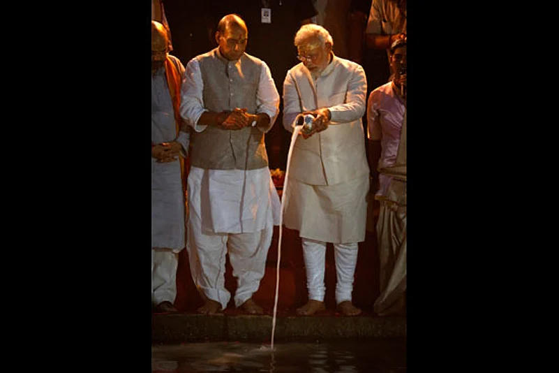 So in March 2014, both Kejriwal and Modi came to Banaras as self-proclaimed admirers of Gandhi. But, unlike the Mahatma, both were careful to pay formal obeisance to Hindu orthodoxy. Both took a ritual dip in the Ganga; both visited the Kashi Vishwanath Mandir to seek the deity’s blessings, neither commenting on the dirt and the filth that still—a hundred and more years after Gandhi had visited it—is so manifest in the temple and its surroundings.