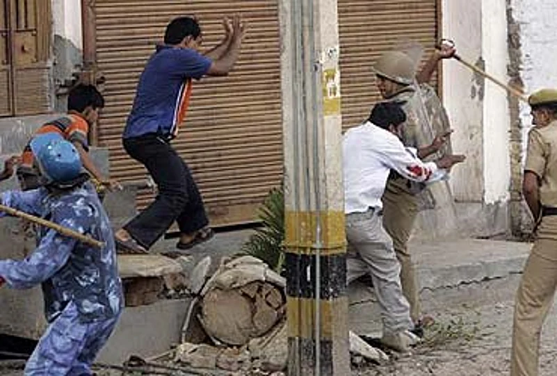 About 50 policemen, including the area DeputyCommissioner of Police Devesh Shrivastava, were injured when the assembled crowds pelted them with stones. Eye-witnesses claim that those pelting stoneswere not just traders, but others, possibly instigated by "anti-socialelements". The police fired back tocontrol the crowd. In the end, it left at least three dead, among them aseven-year-old boy and a 15-year old returning from school, and a manin his early 40s, who has not yet been identified.