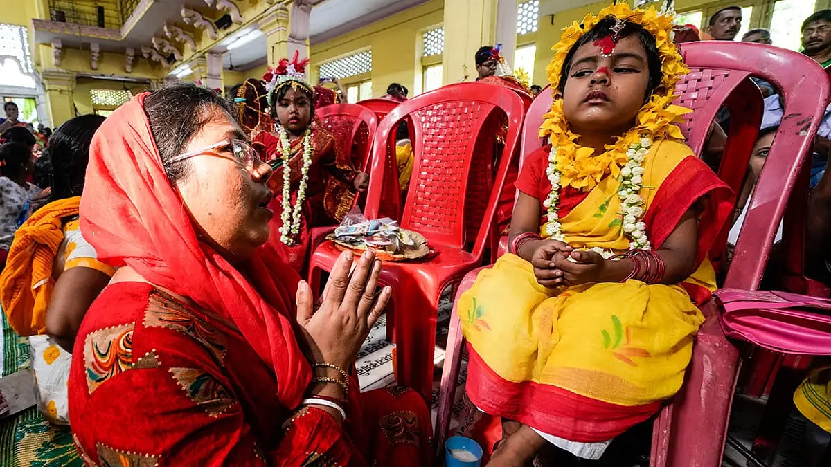 Bengali Hindus on Sunday observed Basanti Durga Puja in Kolkata. Young girls yet to attain puberty were dressed as living goddesses to be worshipped as “kumari”.
