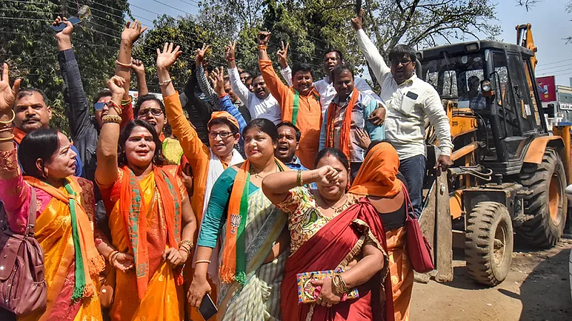 As the BJP sweeps power in Uttar Pradesh, supporters in Lucknow were seen celebrating the saffron party's victory by mounting a bulldozer.
