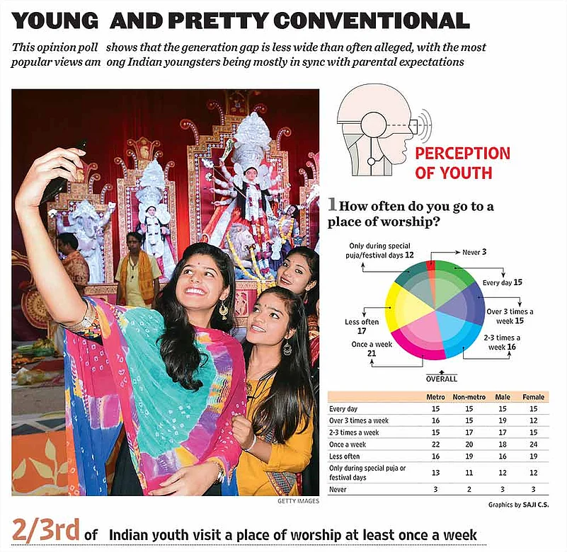 Convinced that it was an opportune time to delve into our youth, Outlook contracted Karvy Insights—an organisation of repute for market research—to tap into the minds of youngsters between 18 and 21 years, spread across eight cities. The cities were carefully chosen to capture the country’s geographical diversity. While big metros such as Delhi, Calcutta, Mumbai and Chennai figured obviously in our list, so did tier-two cities such as Lucknow, Indore, Kochi and Guwahati. The idea was to get a scientific sampling of wide-ranging thoughts on diverse issues from divergent backgrounds.