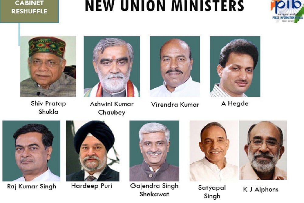 Among new faces, Satyapal Singh, Ashwini Kumar Chaubey, Gajendra Singh Shekhawat, Hardeep Singh Puri, R K Singh, Anant Kumar Hegde, Alphons Kannanthanam, Virendra Kumar, and Shiv Pratap Shukla took oath as ministers.