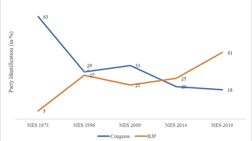 Finally, we noted that the social composition of those who identify with a party and report being a member, has undergone a major transformation. While the bottom half of the social pyramid—lower castes, the poor, women, religious minorities, less educated, etc—continue to remain proportionally under-represented, their share has risen significantly since the 1970s. In that sense, these two metrics reflects democratisation. In addition, the partisan composition of these two metrics has closely followed the trajectory of changing party systems in India. The data in Figure 2 on party identification reflects the altered position of the Congress and the BJP in the political setup.