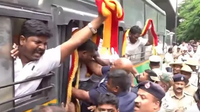 Karnataka Rakshana Vedike activists led by Praveen Shetty staged a protest in Bengaluru's K R Puram by blocking the highway. He and scores of activists were detained and taken away by the police.