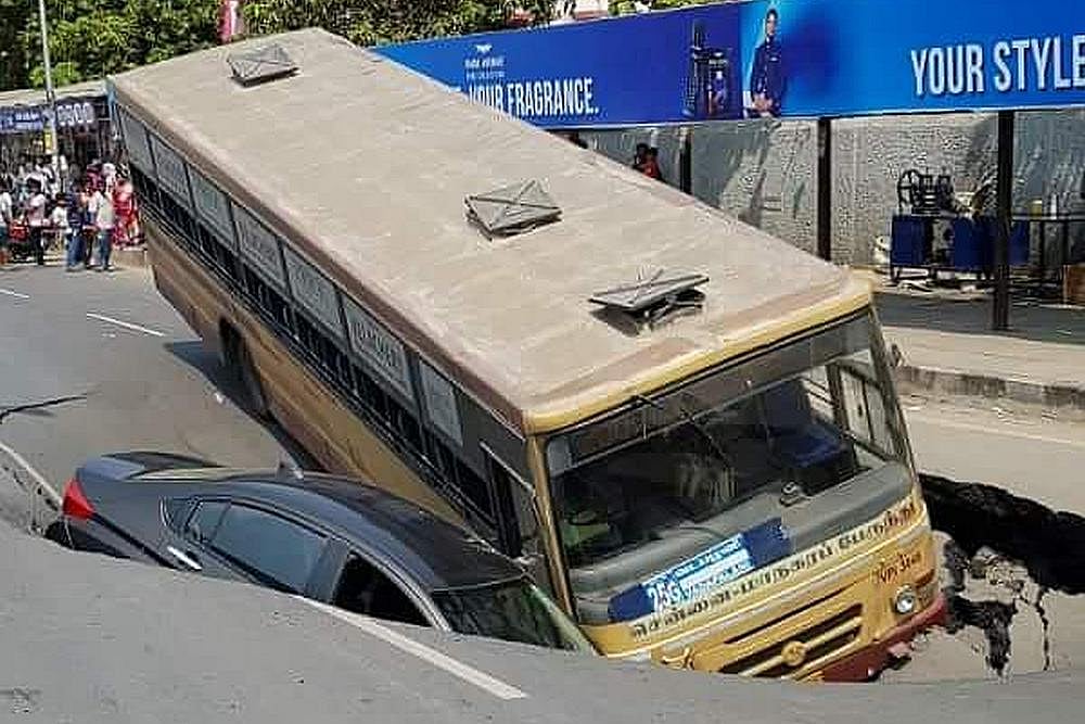The Hindu reported that a bus and a car were pulled down due to the cave-in but no one was injured. The bus had stopped at a bus stop when it began to sink as if the air has been let out of the tyres. All the 35 passengers were asked to get down immediately. The fire force was brought in to pull out the bus and the car and the traffic was soon diverted to other routes.