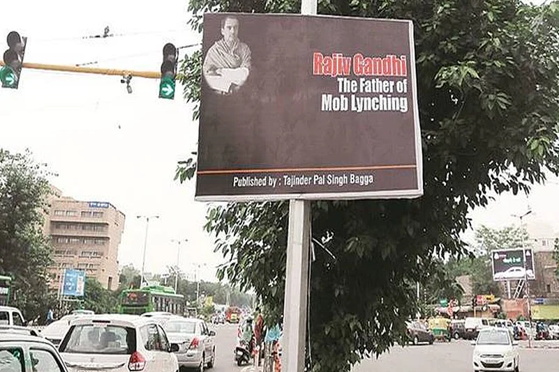 A poster at Delhi's ITO put up by BJP spokesperson Tajinder Pal Singh Bagga calling Rajiv Gandhi “the father of mob lynching” has drawn the flak from the Congress party, which has called it a “disrespect to the nation and dignity of the chair of the country’s Prime Minister”.