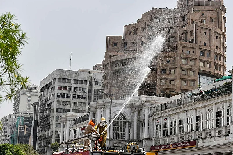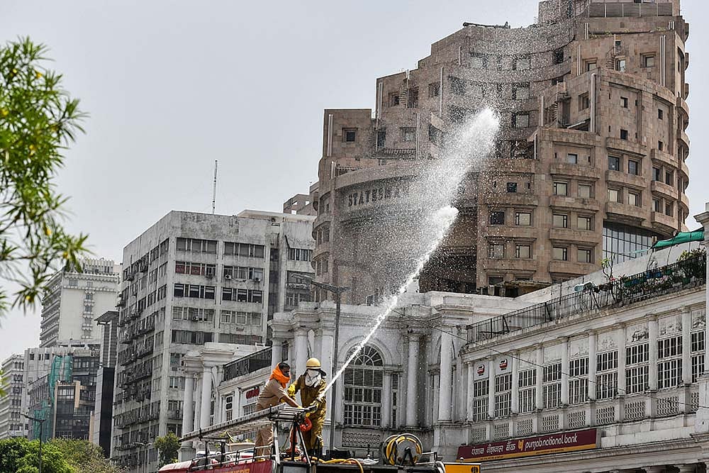 A sanitisation exercise under way in Connaught Place, the city’s commercial centre.