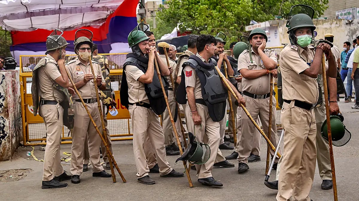 The five-member delegation of the Communist Party of India (CPI) sat on a dharna near the barricades at Kushal Chowk in Jahangirpuri after being stopped by the security personnel.