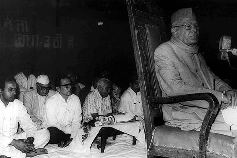 A solid phalanx of humanity covered the historic Ramlila grounds on the night of June 25, endorsing the call for Indira Gandhi to step down. JP recited Ramdhari Singh Dinkar’s evocative poem, ‘Singhasan khaali karo/ke janata aati hai (surrender your throne, for the people are coming)’, to thunderous applause. The crusty septuagenarian Morarji Desai from the Congress (O), who had come out of semi-retirement to spearhead the agitation to get rid of the corrupt Congress chief minister of Gujarat, Chimanbhai Patel, was on the dais. So was Raj Narain, the maverick wrestler-politician—it was he who had set the wheels in motion against Mrs Gandhi by filing a case against her in the Allahabad High Court for electoral malpractices in her constituency of Rae Bareli, where he had contested against her. The RSS pracharak (‘propagator’) and Jana Sangh strongman Nanaji Deshmukh and the Delhi Jana Sangh boss, Madan Lal Khurana, were also present.