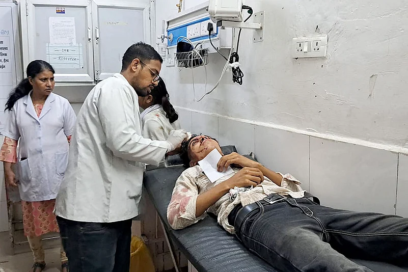 An injured patient being treated after an accident, in Haridwar. More than two dozen passengers were injured, four critically, after a bus fell off a bridge near the Har ki Pauri in Uttarakhand's Haridwar.