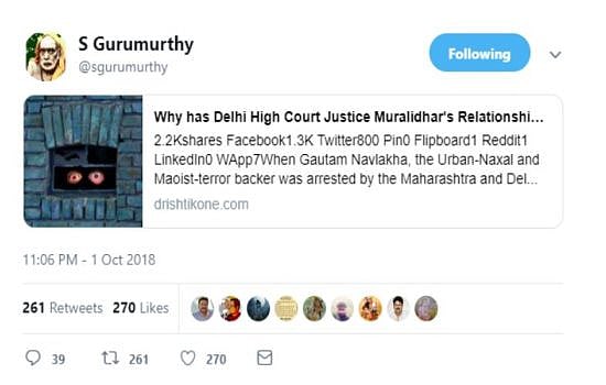 Gurumurthy had retweeted a link to a blog called ‘Drishtikone’, titled ‘Why has Delhi High Court Justice Muralidhar’s relationship with Gautam Navlakha not been disclosed?’