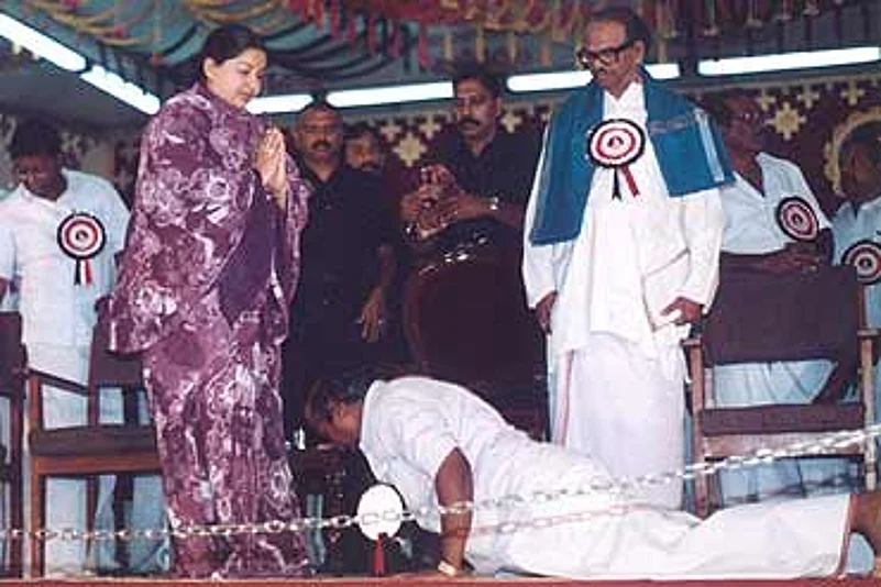 An AIDMK worker falls at Jayalalitha’s feet at a public function