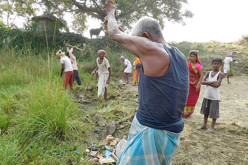 A few days ago, they uncovered another fraud. The mukhiya of a nearby village had hired machines at night to do the work earmarked for labourers. The sanghatan members were unlikely to take this lightly. They did a spontaneous rasta-roko. The District Development Office and other officials had to turn up to assuage them. But there remain markings on the worksite to clearly indicate signs of an attempted cover-up.