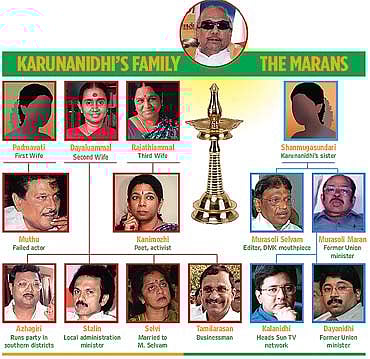 In fact, once Karunanidhi wrested supreme control over party affairs in the post-Annadurai period, he has consistently favoured various progeny in his banyan tree-like family. His love for his family makes Karunanidhi even forgive and forget murders—be it the alleged role of Azhagiri in the murder of former DMK MP T. Kiruttinan, or the recent death of the three employees of Dinakaran in the Madurai violence. While DMK seniors and Karunanidhi's immediate family can't hide their glee over having humbled the Marans, Azhagiri has received not a word of reprimand.