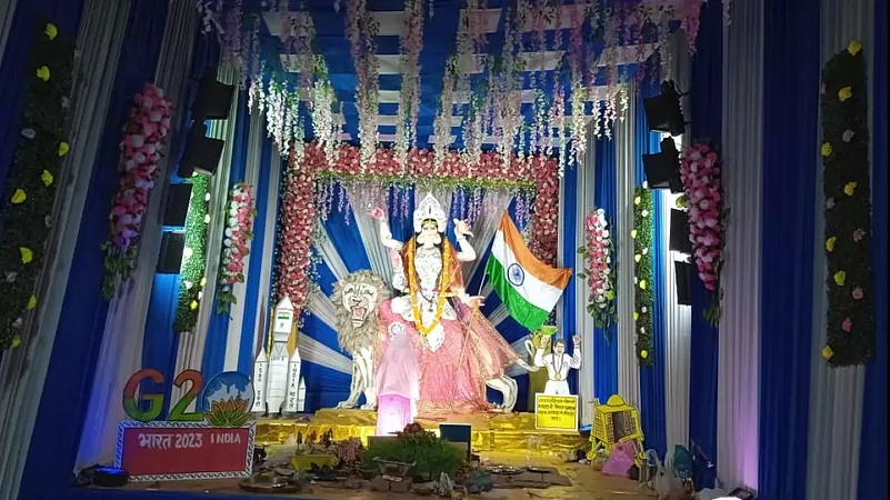 Bharat Mata must have found its way into Durga Puja pandals when our country was struggling for independence from the British Raj. When our country gained independence and there was a resurgent India, Bharat Mata was invented as an incarnation of Goddess Durga to instil patriotism mixed with religion. While Bharat Mata or Mother India, the national personification of India, has been around, the symbolic avatar is now becoming more pervasive in the Durga puja pandals.