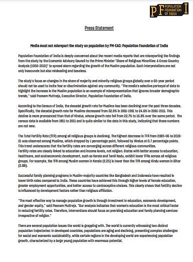 Amidst widespread media coverage of a report on the significantly growing Muslim population and shrinking Hindu population in India within the time frame of 1950 to 2015, the Population Foundation of India (PFI), an independent think tank, raised concerns against the media's 'selective portrayal of data' and termed it 'misleading' and 'inaccurate' reporting.