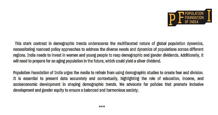 Furthermore, citing examples of Kerala and Tamil Nadu, PFI also mentioned that the Total Fertility Rate (TFR) among all religious groups has been steadily declining owing to several broader socio-economic factors including access to education and healthcare which share a direct relation with lower fertility rates across all religious lines.