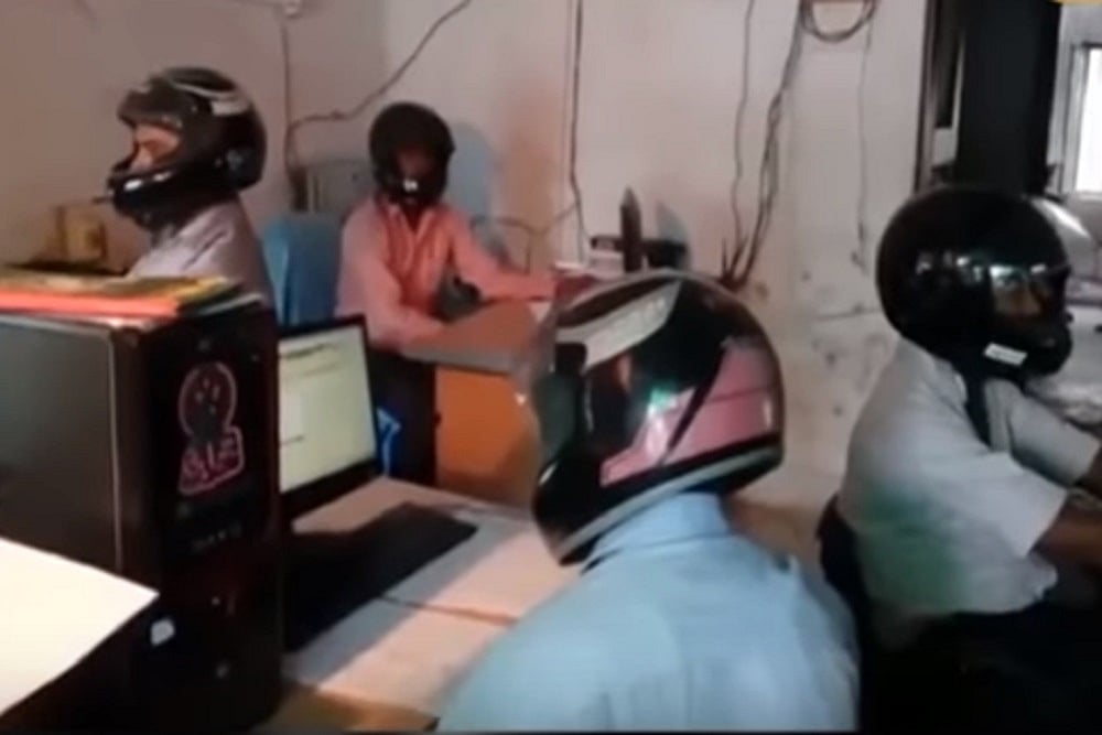 In Bihar's Champaran district, employees in a government office wear helmets while working inside office to protect themselves from falling parts of roof.