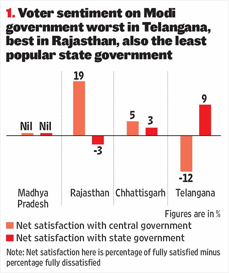 A crucial factor in the defeat of the BJP governments in Chhattisgarh, Rajasthan and Madhya Pradesh was the levels of dissatisfaction of the voters with primarily the state government, but also the government at the Centre. The Lokniti-CSDS survey data for the three states indicates that the levels of dissatisfaction with the performance of the state government was relatively high. Coupled with this was the fact that voter satisfaction with the BJP-led central government was minimal in Chhattisgarh and Madhya Pradesh. A little higher level of satisfaction in Rajasthan with the central government could not offset the heightened discontent with the state government. On the other hand, in Telangana, the incumbent TRS government was rated quite positively in terms of performance, while the same voters were critical of the performance of the central government. The survey findings clearly point out the impact of public perceptions of government performance primarily at the state level (as also tangentially at the national level) in deciding whom they would like to vote for (see Table 1).