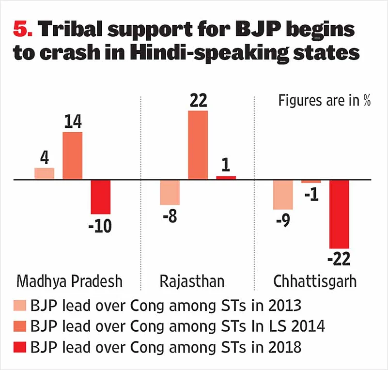 A similar trend is noticed with regard to the tribal vote if one were to analyse the Lokniti-CSDS survey data. In the 2014 Lok Sabha polls, the BJP was 14 percentage points ahead of the Congress when it came to the tribal vote, but the post-poll survey after the just concluded elections indicates that the BJP has fallen behind the Congress by 10 percentage points. In Rajasthan, the BJP had a 22 percentage point lead over the Congress in 2014 when it came to the tribal vote. Now this lead has fallen to merely one percentage point. In Chhattisgarh, which has a significant tribal presence, the BJP is 22 percentage points behind the Congress among the tribals (see Table 5).