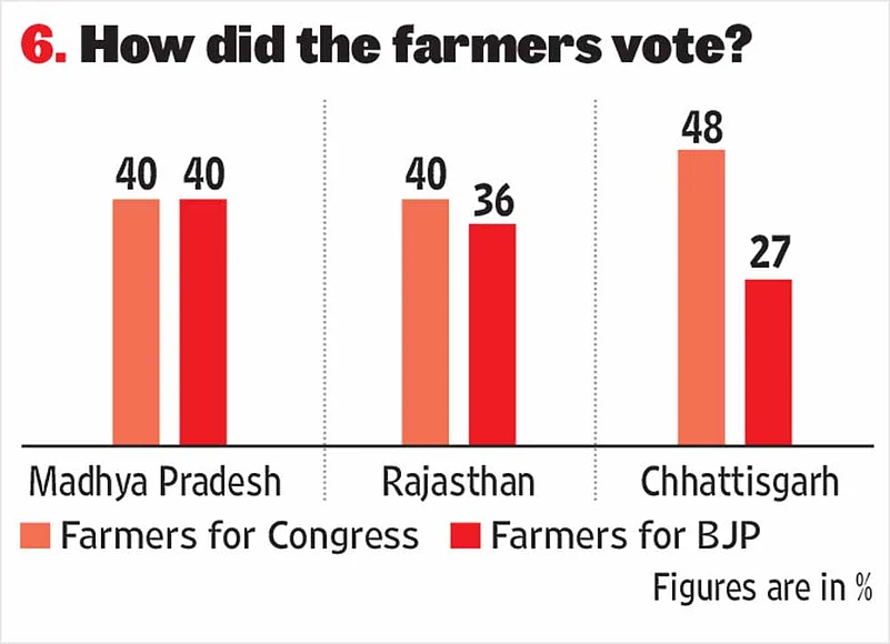 Rural distress appeared to be a critical factor in the three states of North India that went to the polls. In Rajasthan and Chhattisgarh, the Congress secured a higher percentage of the farmers’ vote as compared to the BJP (see Table 6). A linked development is the sharp fall in the BJP vote in the rural areas in the three states. Given the large chunk of rural population in these states (a similar trend was seen in Gujarat last year, but the urban vote in that state helped the BJP retain power), the BJP appears to have lost a significant number of rural seats in all the three states.