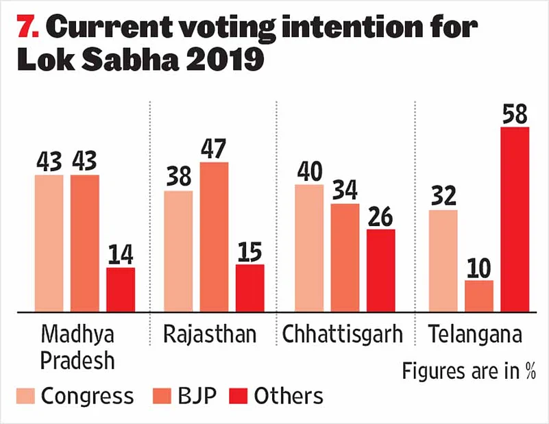 While the Congress can rejoice on its return to winning ways, it also needs to bear in mind that having lost power in Mizoram, it is no longer in power in any state of the Northeast. Down south, its efforts to form a grand alliance with the TDP and the Left parties could not prevent the TRS from returning to power. In preparation for next year’s national polls, the two major all-India parties, the Congress and the BJP, face severe challenges. The Lokniti-CSDS survey in the states that just went to the polls sought to tap the public mood on next year’s Lok Sabha polls. It is interesting to note that the expression of party preference if a Lok Sabha poll were to be held today was very much in consonance with the results in the assembly polls in all the states except Rajasthan—the only state where respondents seemed to favour the BJP if Lok Sabha elections were to be held now (see Table 7).