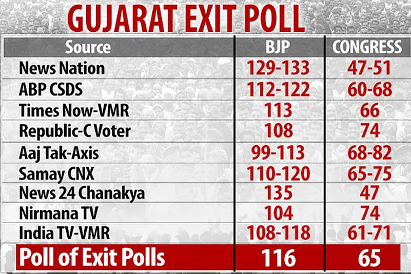 An exit poll by Today's Chanakya had given BJP 135 seats in Gujarat and predicted a measly 47 for the Congress, 14 less than the opposition party had in the current Assembly.