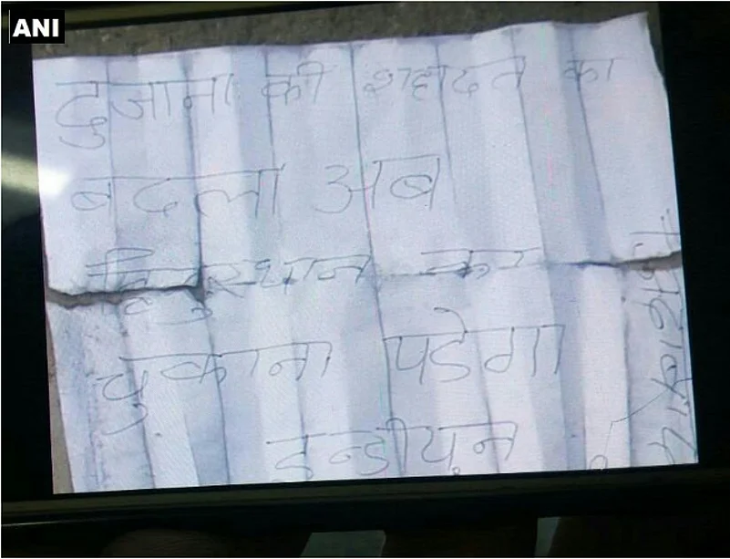 The handwritten letter found along with the bomb warned there will be retaliation to the killing of top Lashkar-e-Taiba (LeT) militant Abu Dujana in Jammu and Kashmir.
