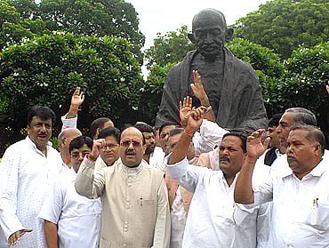 That was then: Amar Singh leads a protest against the N-deal--in Parliament, Aug 13, '07