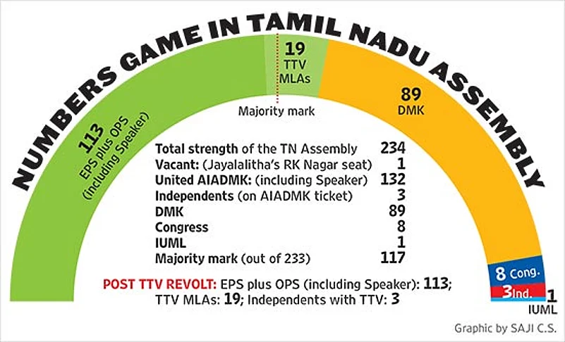 The Dhinakaran group has already sounded out assembly Speaker P. Dhanapal as a possible replacement for EPS. Their calculation: since the AIADMK has 31 Dalit MLAs, they would rally behind Dhanapal, who belongs to the Arunthdhiyar sub-sect among Dalits, one of the most backward communities in the state. That would also give second thoughts to the DMK about toppling a government headed by a Dalit. “The Sasikala family has been betrayed by a Thevar (OPS) and now a Gounder (EPS)—the two backing communities of the AIADMK, notes political commentator Ravindran Durasamy. “So they are placing their bets on a Dalit, hoping he would be more subservient. Ultimately, the family wants to be in control of the 1972-founded party, which has been their oxygen for survival and expansion of their business interests.”