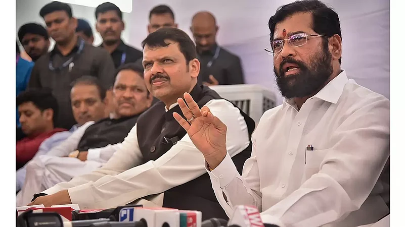 Full-page advertisements were carried across major newspapers in the state on Tuesday, citing a survey that showed CM Shinde ahead of his deputy Fadnavis in popularity. It did not have the pictures of either Fadnavis or Bal Thackeray.