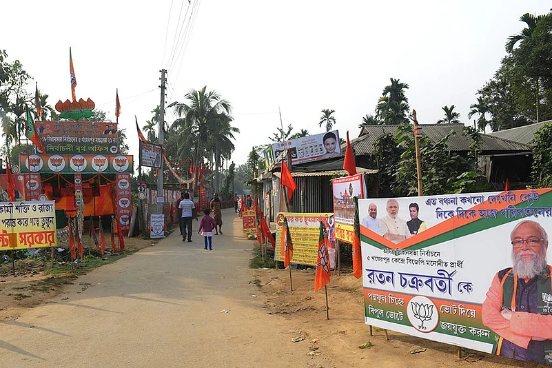 Now, as tiny Tripura gears up to vote, the BJP has emerged as a serious challenger to the CPI(M) that has been running governments in the state for a quarter century—the last two decades of it with Manik Sarkar as the chief minister. Despite the high anti-incumbency disenchantment with his government, the 69-year-old’s austere personal image remains largely undamaged. The Congress as the main Opposition has been nearly wiped out. Seven of that party’s 10 MLAs have switched to the BJP after a brief sojourn in Trinamool Congress (TMC). Another has joined the CPI(M), leaving the grand old party with only just two legislators. The TMC too has a negligible presence in the state. Some flags and banners of its supremo Mamata Banerjee appeared near the airport just before a few senior party leaders landed from Calcutta for some perfunctory campaigning.
