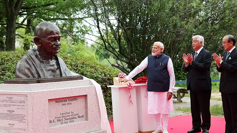 Again, in Hiroshima in July, where he was to attend the G7 outreach meeting, Modi unveiled a bust of Gandhi. Hiroshima, the place where the United States dropped an atomic bomb just before World War II ended, was a fit place to have a bust for the man who preached non-violence all his life.