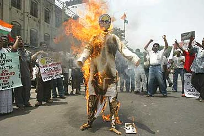Congress activists burn an effigy of West Bengal CM Buddhadeb Bhattacharjee demanding withdrawal of sales tax on petrol and diesel.