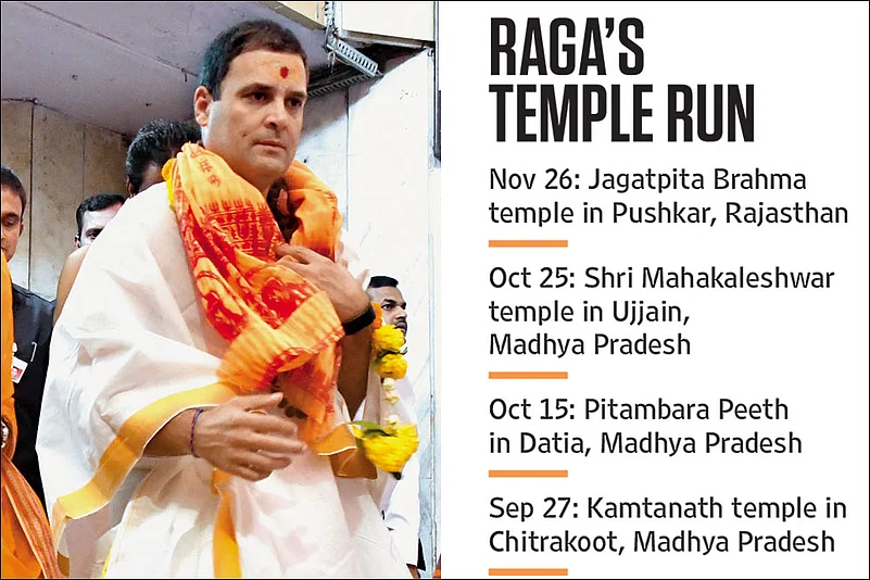 Congress president Rahul Gandhi chose the 14th-century temple of Brahma in Pushkar, Ajmer, in poll-bound Rajasthan, to furnish his Brahminical credentials—a Kaul Kashmiri Brahmin of Dattatreya gotra. It was done unobtrusively, almost naturally, during the course of a puja on November 26. Mere detail? A banal formality one encounters when, say, filling up a form? Well, not quite. The act spoke volumes, and eloquently. Culminating a series of public gestures, made in the backdrop of competing gestures, it framed a fundamental shift in India’s political climate. If one asks what the key difference is between the 2014 general election and the upcoming one, it could be this. ‘Congress vs BJP’ was once categorised, even if not very neatly, as ‘secular vs communal’. An overt touch of ‘Hindu vs Hindutva’ has now coloured that equation. The Congress offers a nuanced gradation there, but it’s a risky tactic that seems to be setting off a domino effect—with unforeseen consequences.