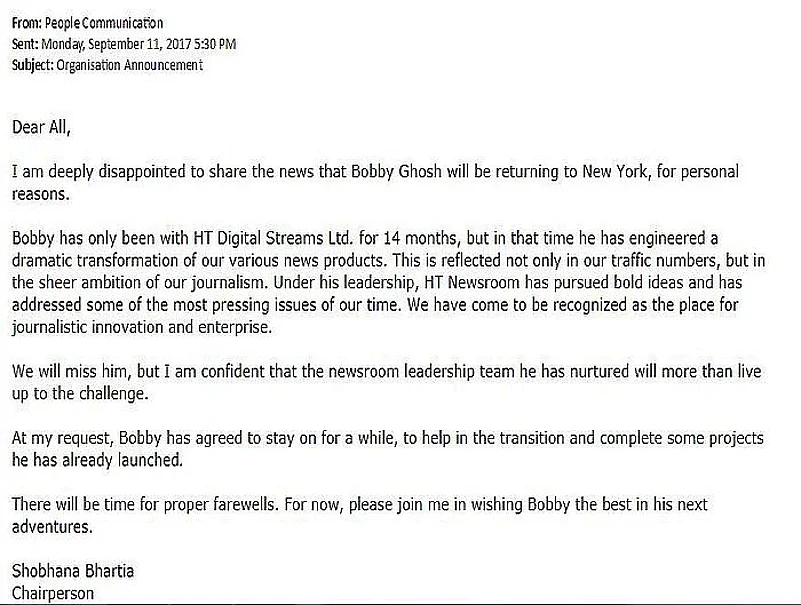 In an official email to her employees, Bhartia said: “I am deeply disappointed to share the news that Bobby Ghosh will be returning to New York, for personal reasons.”