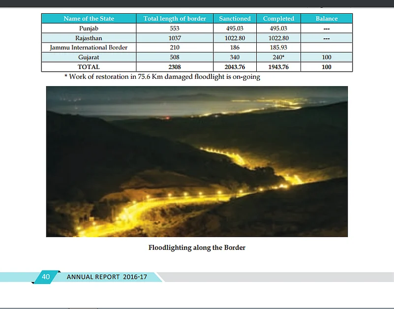 The annual report, with the picture inserted in it, said :'In order to curb the attempt of infiltration and cross-border crimes along the Indo-Pakistan Border, the Government has sanctioned 2043.76 km of floodlights along the International Border in the States of Jammu & Kashmir, Punjab, Rajasthan and Gujarat.'