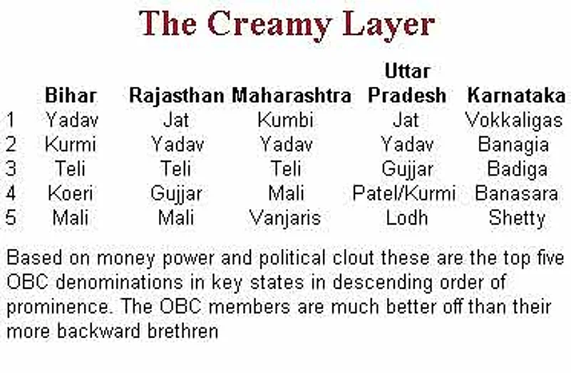 Which brings us to the debate over reservation for OBCs spelt out in the Mandal report. Should backward castes be taken as a block for upliftment? There are some who believe that the creamy layer does not deserve any reservation. Making a case for the Most Backward Castes (MBCs) of this group, who make up more than 40 per cent of the OBC population, D. Shyam Babu, Fellow at the Rajiv Gandhi Foundation, says: "Unlike the Scheduled Castes, with the OBCs there have always been landed castes like the Jats and Yadavs of the North and the Gounders of the South. If reservation is extended to all the OBCs without identifying the Most Backward Castes, it can lead to disastrous consequences."