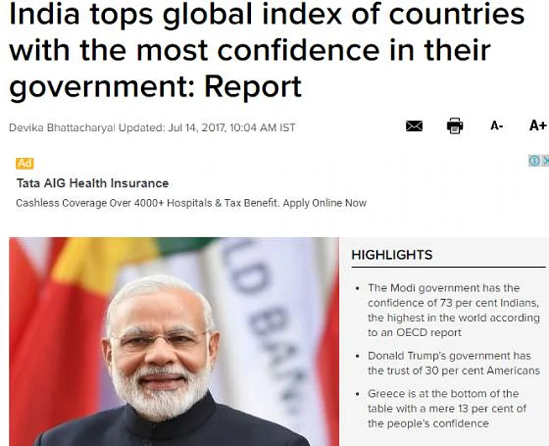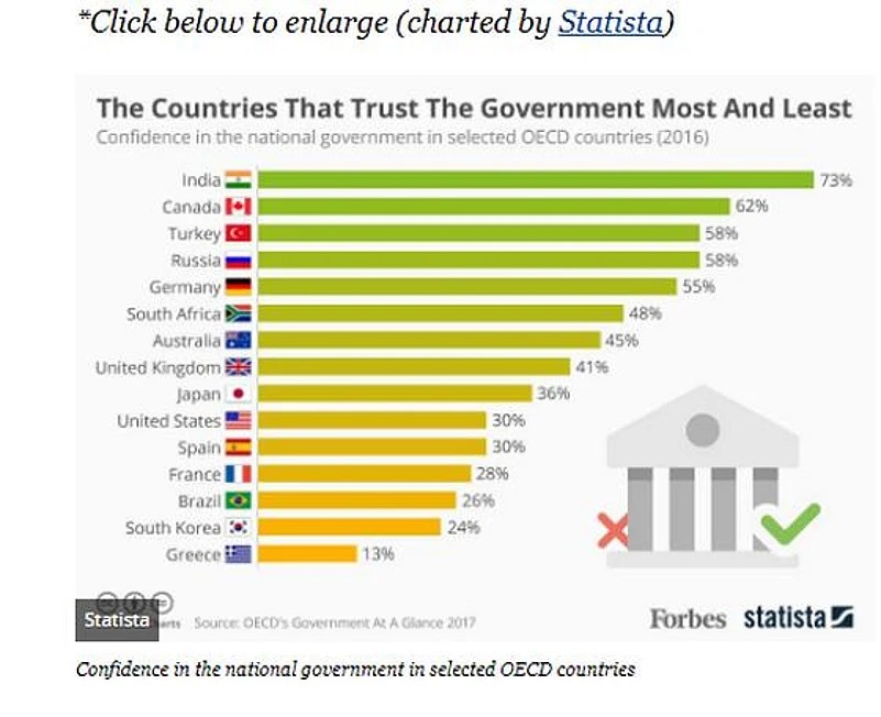 The problem is that the nugget has been picked up, eaten and regurgitated by media outlets in India, with a spin, that will make it viral on WhatsApp. The OECD report, in fact, seeks to measure the confidence that citizens have in their government post-2007 and the financial crisis.