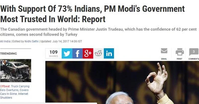 Organisation for Economic Cooperation and Development's (OECD) Government at a Glance report mentions that “73 per cent Indians have faith in the Narendra Modi led NDA coalition”, which is correct. However, as the headline says, India is not the one where the citizens have maximum confidence in it. It is Indonesia and Switzerland jointly sharing the number one slot with 80 percent followed by India at number 3 with 73 percent.