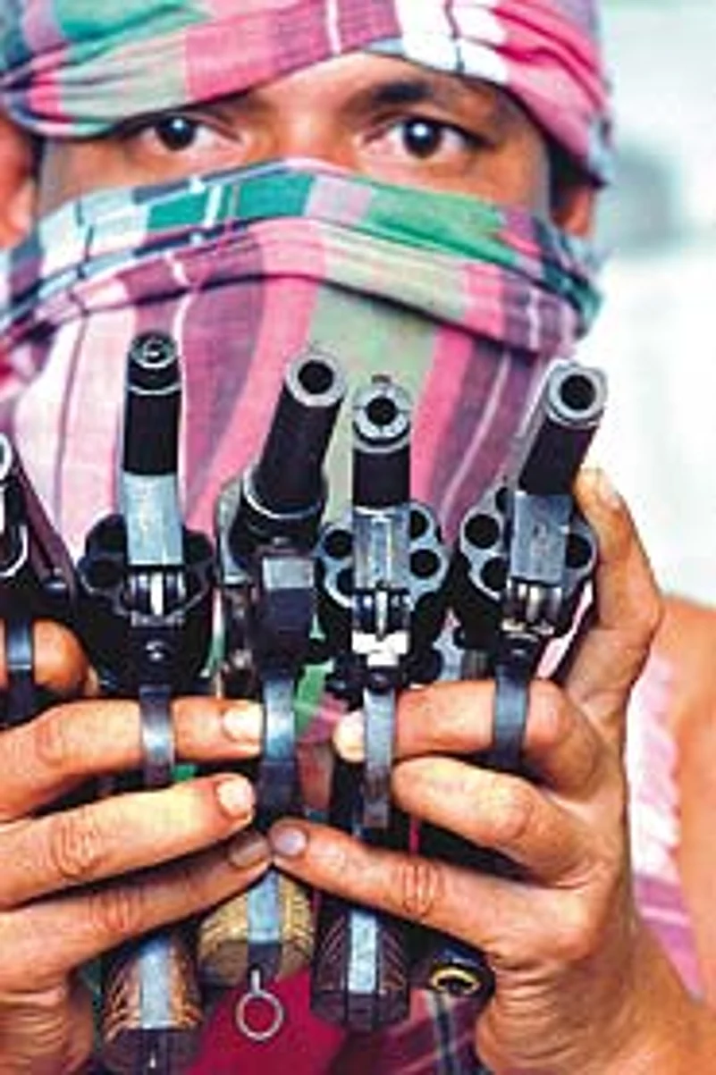 At Behrampur, a nondescript town which serves as the district HQ, we begin enquiries. A local is at hand to help us as we ask around for dealers in arms and explosives. We are taken to a small house in a bylane at Khagra, a small colony tucked away to the north of the town known as the "original Behrampur". Here, a few ordinary looking youth quietly file into a small, dimly-lit room and settle down to business after taking out their "machines" for us to examine. The "machines" in question are Chinese pistols and revolvers, procured by their contacts from across the border. One of the men claims they know the DGFI (Directorate General of Field Intelligence, the Bangladeshi version of Pakistan’s ISI).