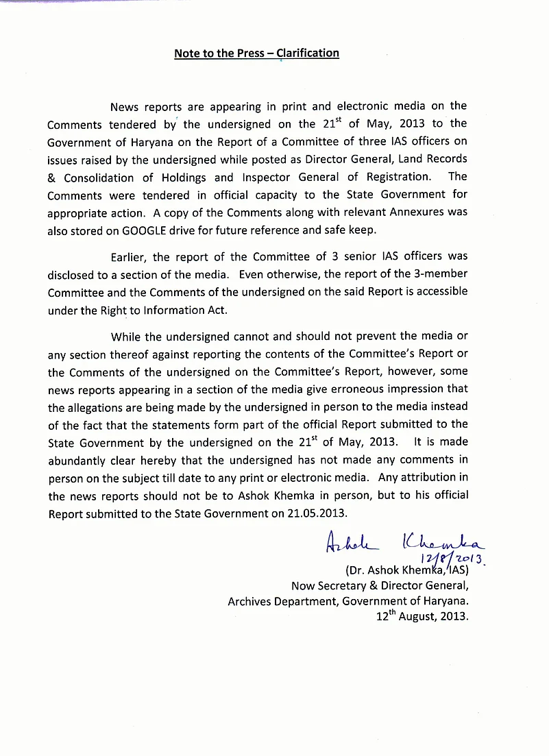 The senior IAS officer refutes reports in a section of the media that the allegations against Robert Vadra have been made by him in person.
