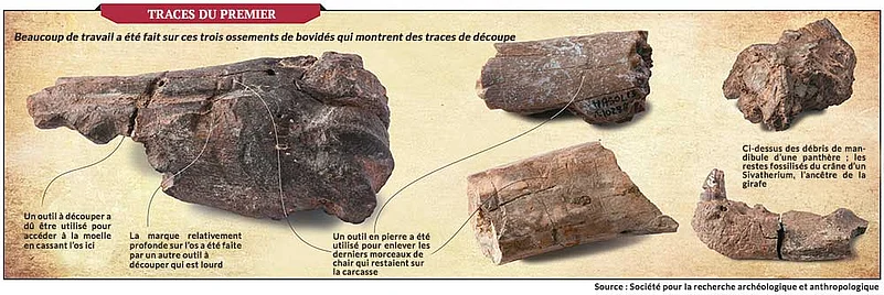 La prise est énorme : l’équipe de chercheurs à Masol a trouvé jusqu’à présent plus de 1 500 fossiles et 250 outils sur les 13 sites inspectés. Trois des ossements de bovidés (les bovidés formaient la plus grande variété d’ongulés, de la famille des vaches) portant de notables traces de découpe ont été envoyés, sur la recommandation du Service archéologique d’Inde, au Centre de recherche et de restauration des musées de France et au Muséum national d’histoire naturelle de Paris. Après y avoir subi des tests, ils ont été déclarés être authentiques.