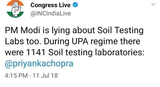 "PM Modi is lying about Soil Testing Labs too. During UPA regime there were 1141 Soil testing laboratories: @priyankachopra", the party tweeted.